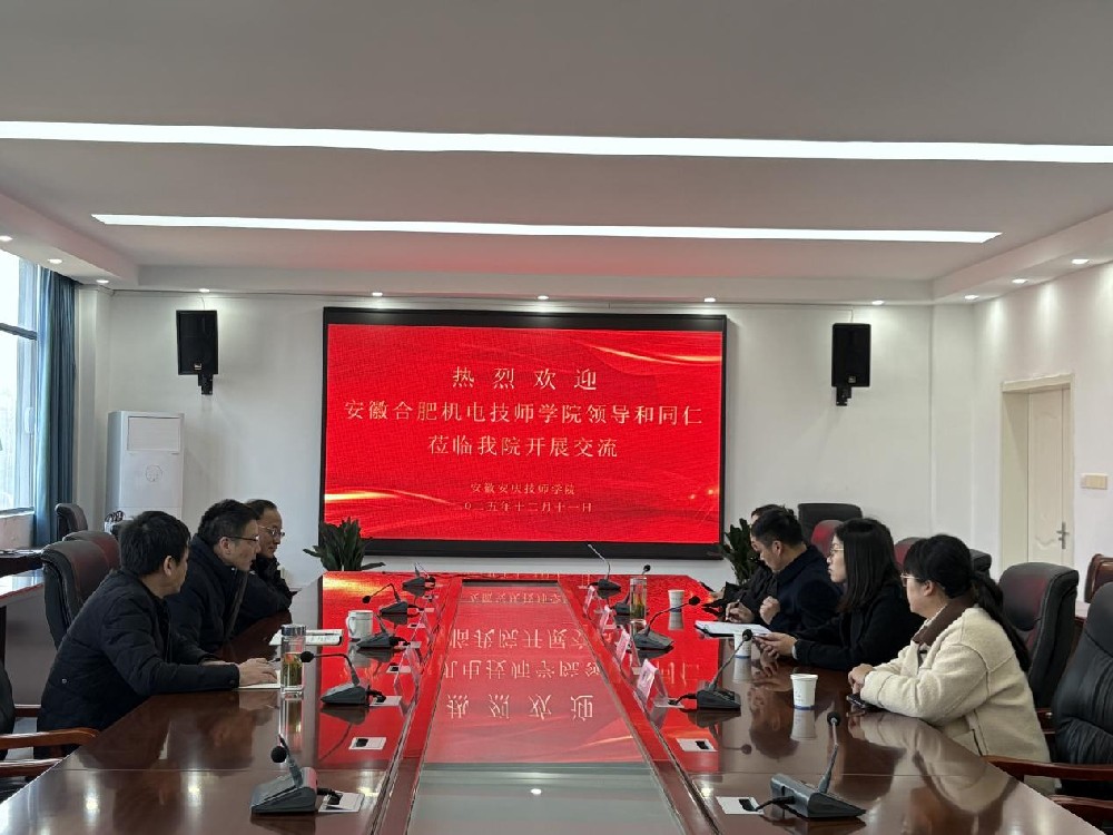 2025年12月11日上午,安徽合肥机电技师学院副院长蒋英发、院长助理陈亚蕾等一行四人赴安庆技师学院开展交流学习。安庆技师学院党委副书记、院长徐英武,党委委员、副院长徐波,教务处处长鲁新建参加座谈会。